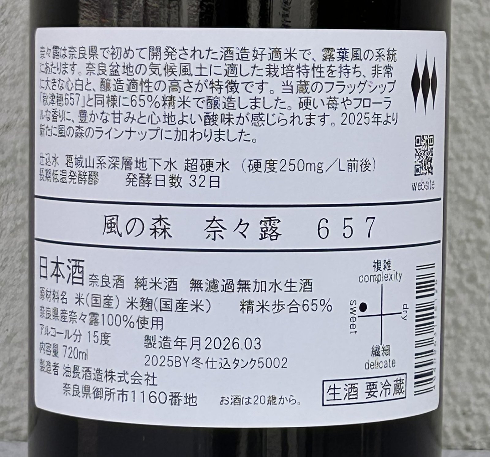 奈良で誕生したこの奈々露を、今後、秋津穂や露葉風に並ぶ、風の森を代表するラインナップに成長できるよう取り組んでまいります。しかしながらまだまだ収量が少なく、暫くは年2本の仕込みになります。今回は冬仕込みにて、3月、4月にお届けいたします。次回は、夏仕込みにて9月頃の発売を予定しております。昨年より新たに風の森のラインナップに加わった奈々露657を、どうぞよろしくお願いいたします。
