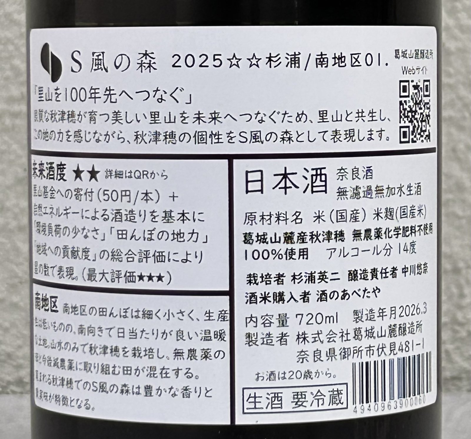 杉浦さんの栽培される秋津穂は、無農薬化学肥料の栽培によって葛城山麓地区の大地の個性が引き出されており、出来上がった S風の森は特有の瑞々しさを持ち合わせます。今回の南地区は、より味わいの立体感や奥行きがしっかりと感じられる仕上がりとなる傾向を感じております。