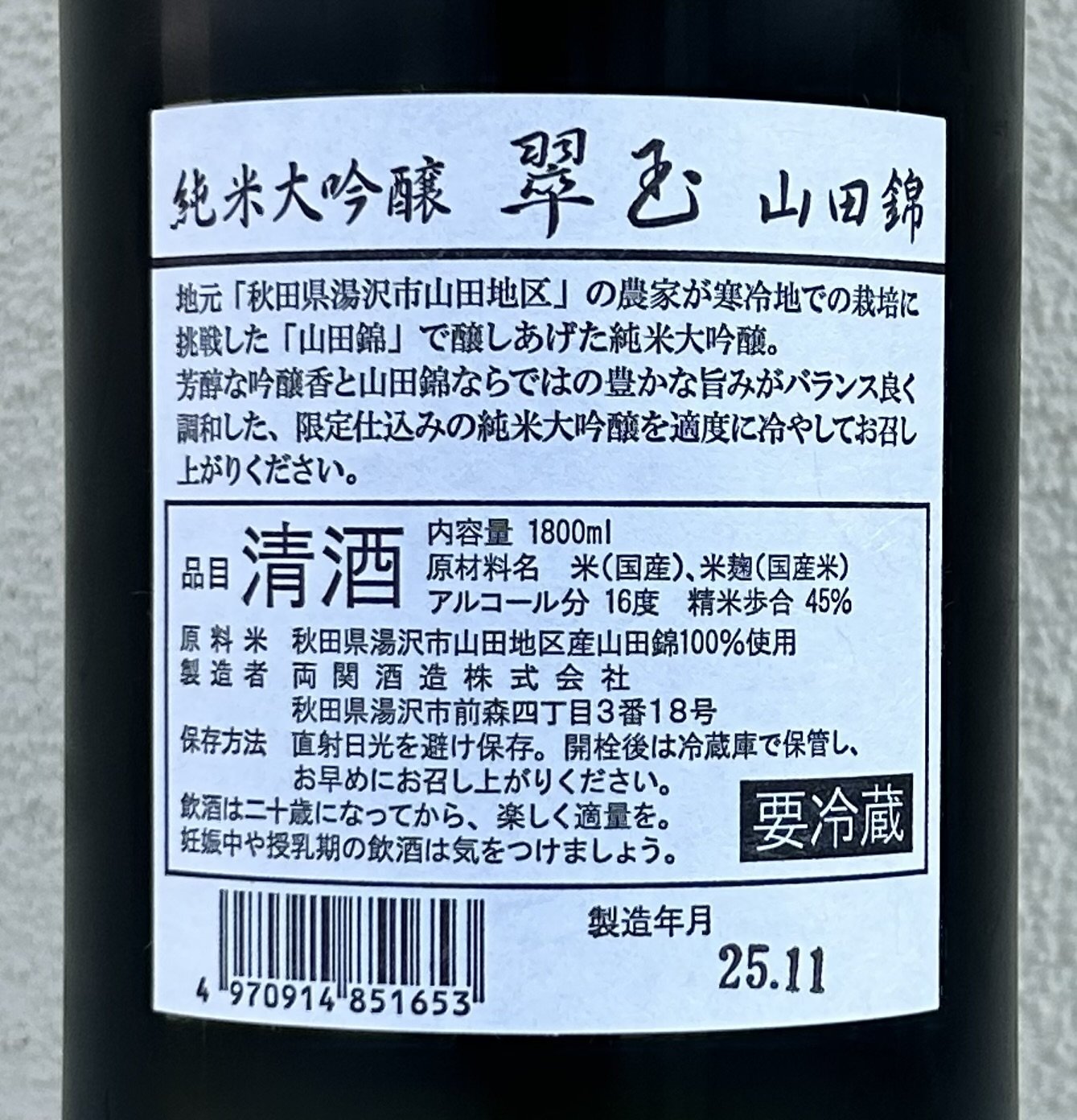 地元「秋田県湯沢市山田地区」の農家が寒冷地での栽培に挑戦した「山田錦」で醸しあげた純米大吟醸。