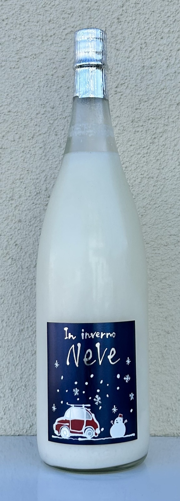 新酒初出荷は、イタリアンラベル冬バージョンです。冬のラベルは、夜に降る雪をイメージして製作しました。NeVe(ネーベ)とは、イタリア語で雪の事なのでお酒も、活性の純米にごり酒にし、透明瓶に入れていますので、置いておくとオリがしずみ、おもちゃのスノーボールのようになります。