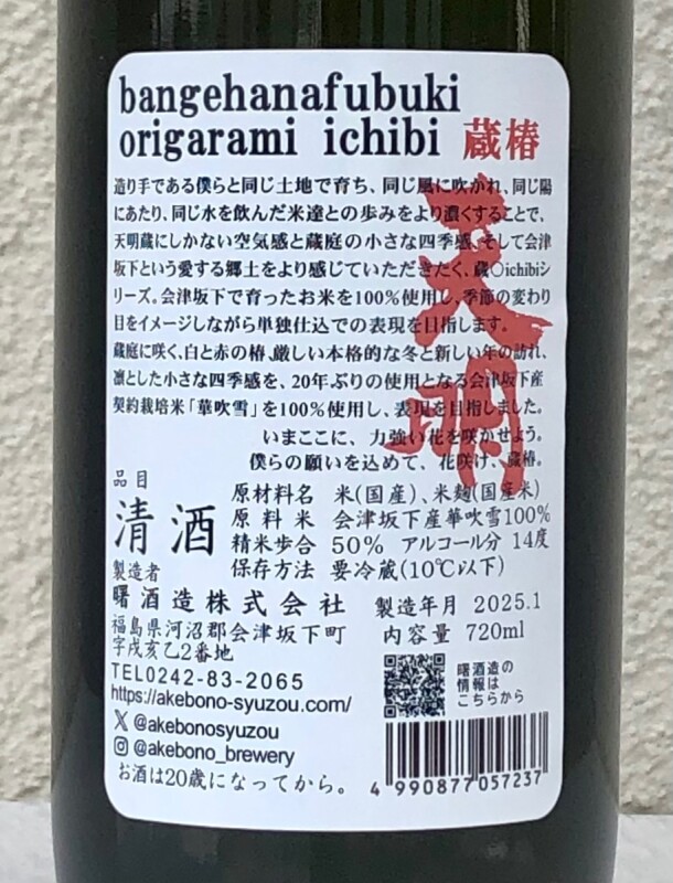蔵の空気感を、会津坂下という愛する郷土をより感じていただきたく、会津坂下産酒造好適米と県酵母に特化した、蔵シリーズをリリースさせていただきます。使用米におきまして、まずは蔵椿が華吹雪を使用。