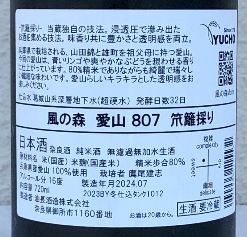 風の森では毎年、兵庫県加東市特A地区で栽培された愛山の酒造りに取り組んでいます。2016年に初めて愛山を使う機会をいただいてもうかれこれ8年、年に2本のタンクを仕込んできました。産地との付き合いももう8年になりました。改めて生産者の方々に感謝の気持ちを伝えたいと思います。8年仕込んできて毎年感じるのはできたお酒のみずみずしさです。甘みの多い少ないに関わらず、圧倒的な透明感は愛山の持つ個性の一つだと考えます。淡い緑ブドウを思わせる軽快な香りに、80%精米ならではの複雑味ある味わい。キラキラとした透明感ある酒質をお楽しみください。