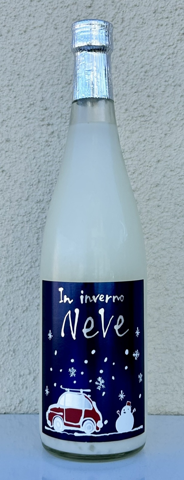新酒初出荷は、イタリアンラベル冬バージョンです。冬のラベルは、夜に降る雪をイメージして製作しました。NeVe(ネーベ)とは、イタリア語で雪の事なのでお酒も、活性の純米にごり酒にし、透明瓶に入れていますので、置いておくとオリがしずみ、おもちゃのスノーボールのようになります。