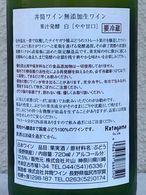長野県の桔梗ヶ原一帯で収穫されたナイヤガラ種ぶどうのストレート果汁を醸造したワインです。ぶどう果汁がワインへと変貌を遂げる発酵過程。その終了間際の状態を発酵タンクから直接瓶に詰めた限定醸造品です
